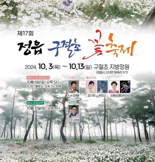 2024 전북 축제 일정 일정표 10월 총정리 세 번째 행사는 정읍 구절초 꽃축제입니다. 사진작가들이 선정한 대한민국 최고의 출사명소, 정읍 구절초 축제는 청정한 산골하천과 천혜의 자연경관을 자랑하는 솔숲을 배경으로 한 동양 최대의 150,000㎡ 구절초꽃동산에서 가을의 절정기인 매년 10월 초에 개최됩니다. 자연이 인간에게 주는 최고의 선물인 순백의 구절초 조망과 함께 지역 향토자원을 테마로 각종 이벤트와 체험, 지역 농특산물 판매행사도 펼쳐집니다.