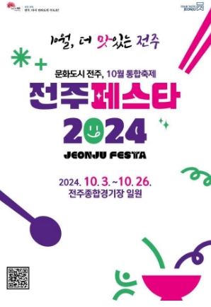 2024 전북 축제 일정 일정표 10월 총정리 네 번째 행사는 전주페스타입니다. 전주페스타는 맛, 멋, 열정을 담은 전주의 다양한 축제들을 모아, 10월 한 달간 선보이는 전주 통합축제로, 2024년에는 "10월, 더 맛있는 전주!"라는 슬로건 하에 문화도시 전주의 모든 것을 담아 전주종합경기장에서 10월 한 달간 개최됩니다. 전주를 대표하는 주요 축제들과 함께 전주페스타의 시작과 끝을 알리는 오프닝·클로징 무대, 전주 '맛' 콘텐츠, 전통놀이, 초대형 드론쇼, 레트로클럽, 술 BOX 등 전주의 맛과 멋 그리고 열정을 보여주는 다채로운 콘텐츠를 10월 한 달간 매주 만나볼 수 있습니다.